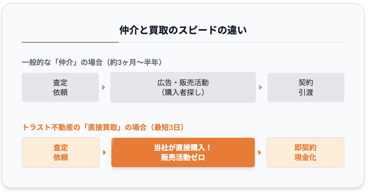 「すぐに現金が必要」「近所に知られずに売却したい」「残置物が多くて片付けられない」。そんなお悩みは、当社が直接買主となる「買取サービス」で解決します。通常の仲介売却と異なり、販売活動の期間が不要なため、圧倒的なスピードで現金化が可能です。